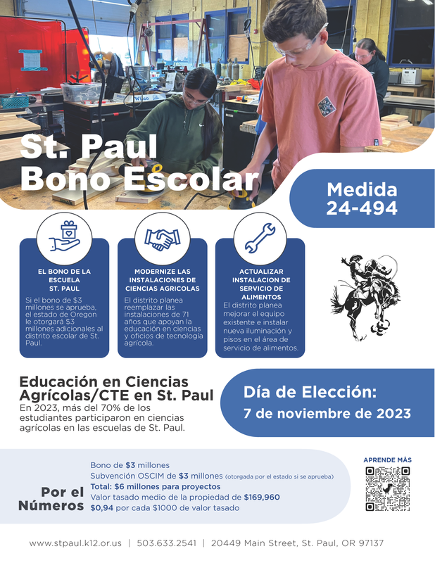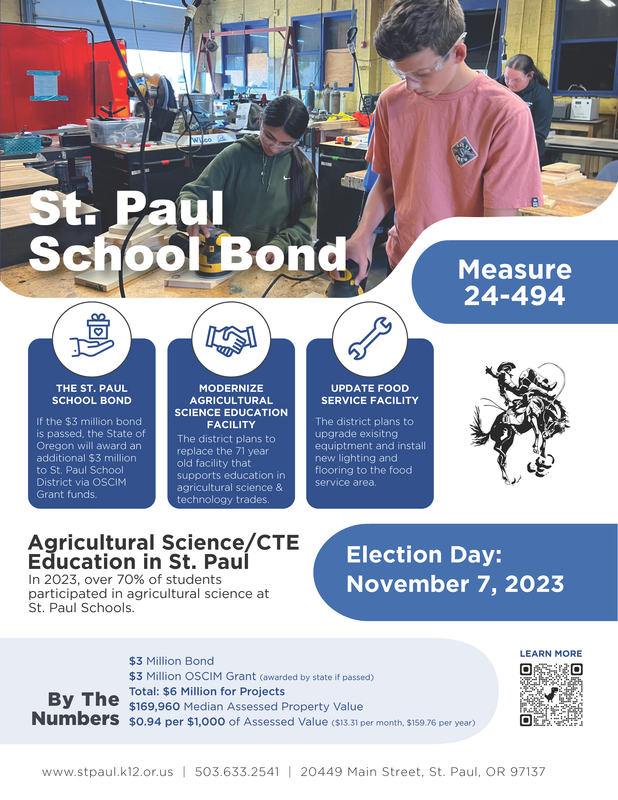 St. Paul Schools are on the ballot this fall. Measure 24-494 would provide a $3 million bond to St. Paul Schools. If passed, the State of Oregon would award an additional $3 million matching OSCIM grant.